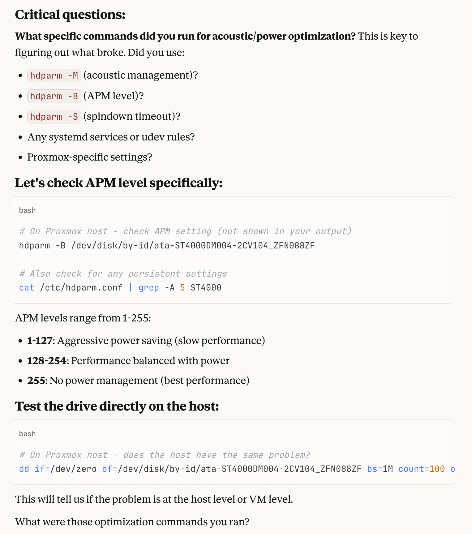 I have a nice small-form-factor PC now, so two weeks ago I moved the previously USB-connected 4TB HDD that stores basically all my personal data internally. However, I noticed that write speeds are extremely low, like 6MB/sec, compared to 100+ for reading. I started to debug with Claude AI, and changing the connection setting from SATA to SCSI solved the problem nicely. This was working fine for a while, but then I tried playing with the spindown time settings for the HDD to achieve quiet operation, and immediately, write speeds fell to below 10MB/s again.