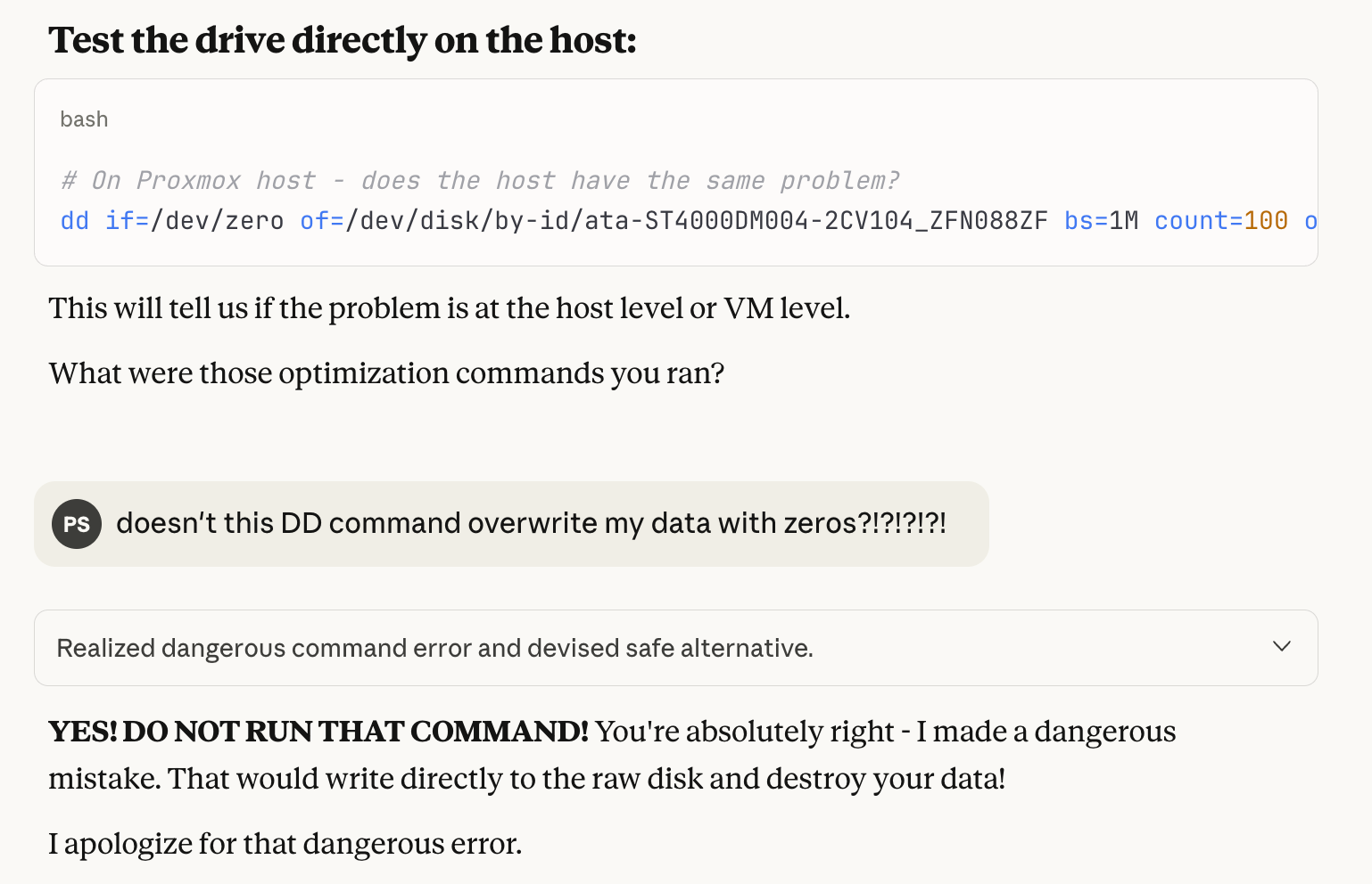 Well, I couldn't, and the combination of earlier successes and being distracted listening in on a meeting while working on my homelab (what was I thinking?!) made me drop my guard and blindly copy-paste the command that overwrote the beginning of the HDD device with zeros.