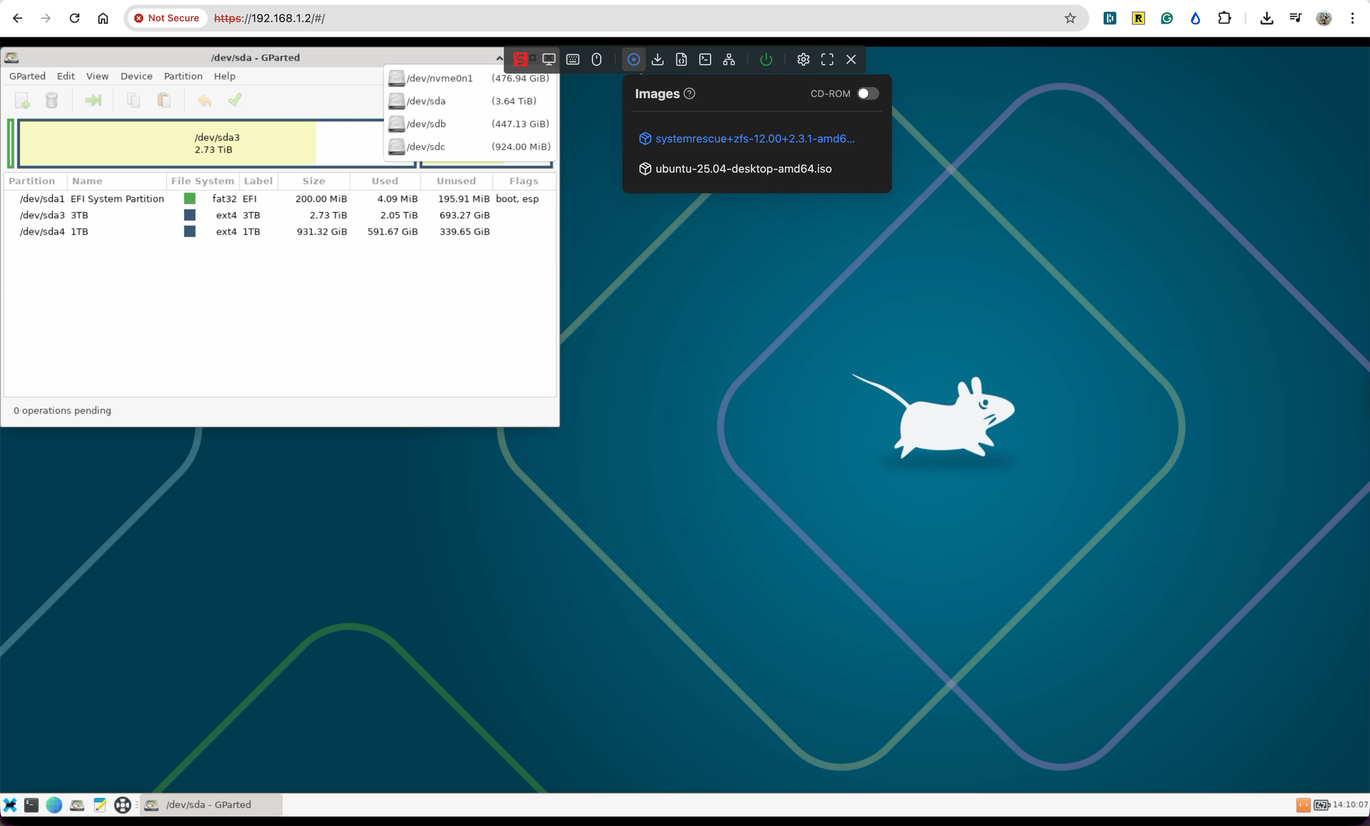 Here's my PC running a NanoKVM-mounted SystemRescue disc, in a Chrome window on my laptop, sitting in an office connecting to my home network via my router's VPN: